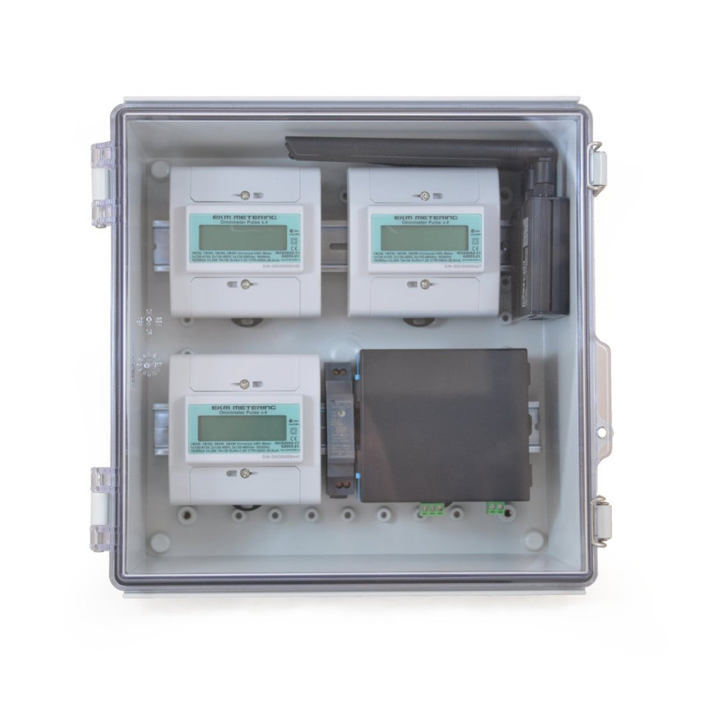 It will also fit a combination of 3 or 4 Omnimeters, along with a Push3, a DIN rail mountable 12VDC power supply, and a Teltonika RUT240 cellular modem.