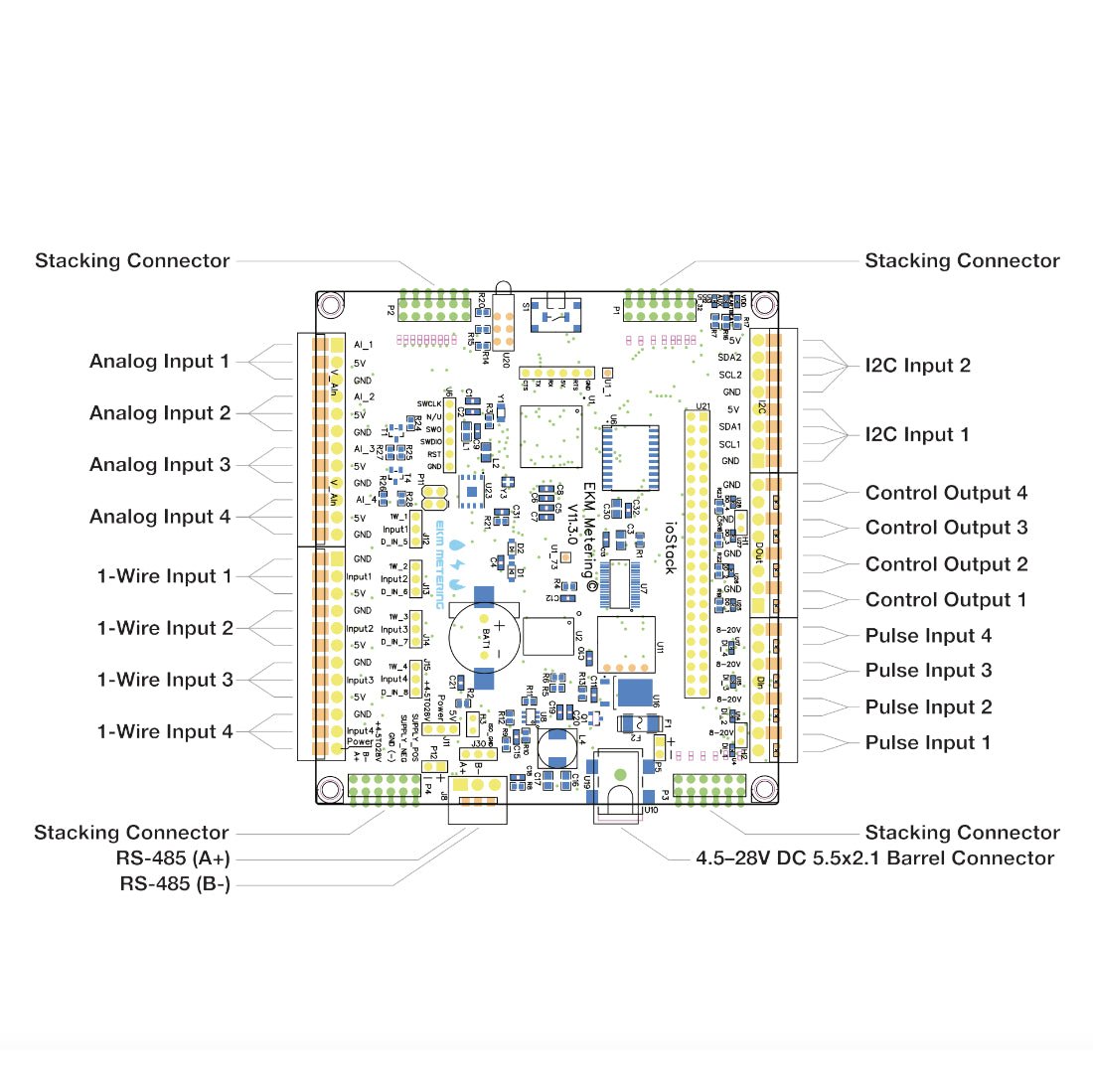 Our EKM-ioStack is a powerful addition to our line of remote readable, affordable metering products. The ioStack is not a meter itself, but it does include a lot of features which will enhance your metering system. The ioStack features 4 separate inputs for pulse counting to pulse from our water and gas meters, 4 separate inputs for analog sensors, 4 separate controllable outputs, 4 separate 1-Wire sensor buses, and 2 separate I2C inputs. The ioStack also communicates over RS485, just like our Omnimeters. It is also supported by our EKM Push3 cloud-based data system.