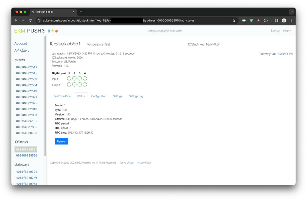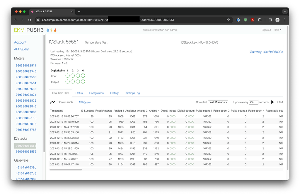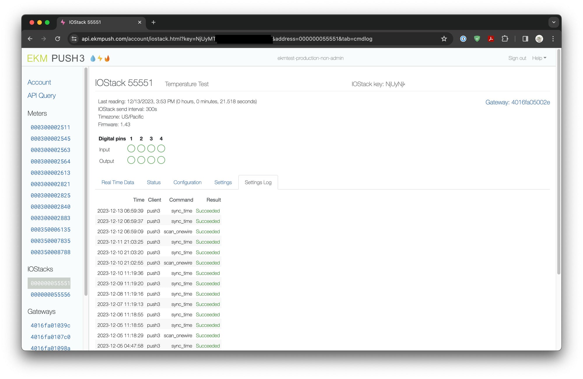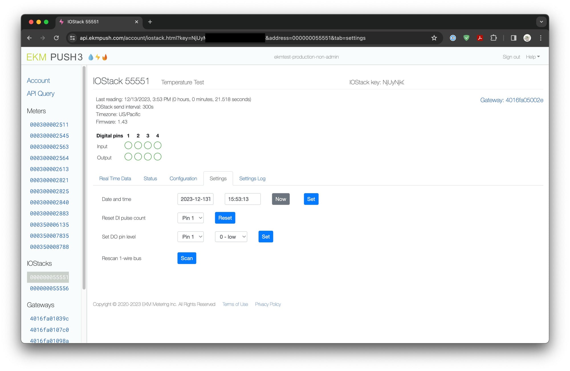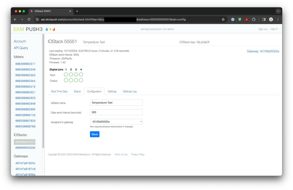Like Omnimeters, ioStacks are listed in your online Push3 Account Portal. When logged in you can view raw data, view the status of your ioStack, configure your Push3/ioStack, and make settings in your ioStack.